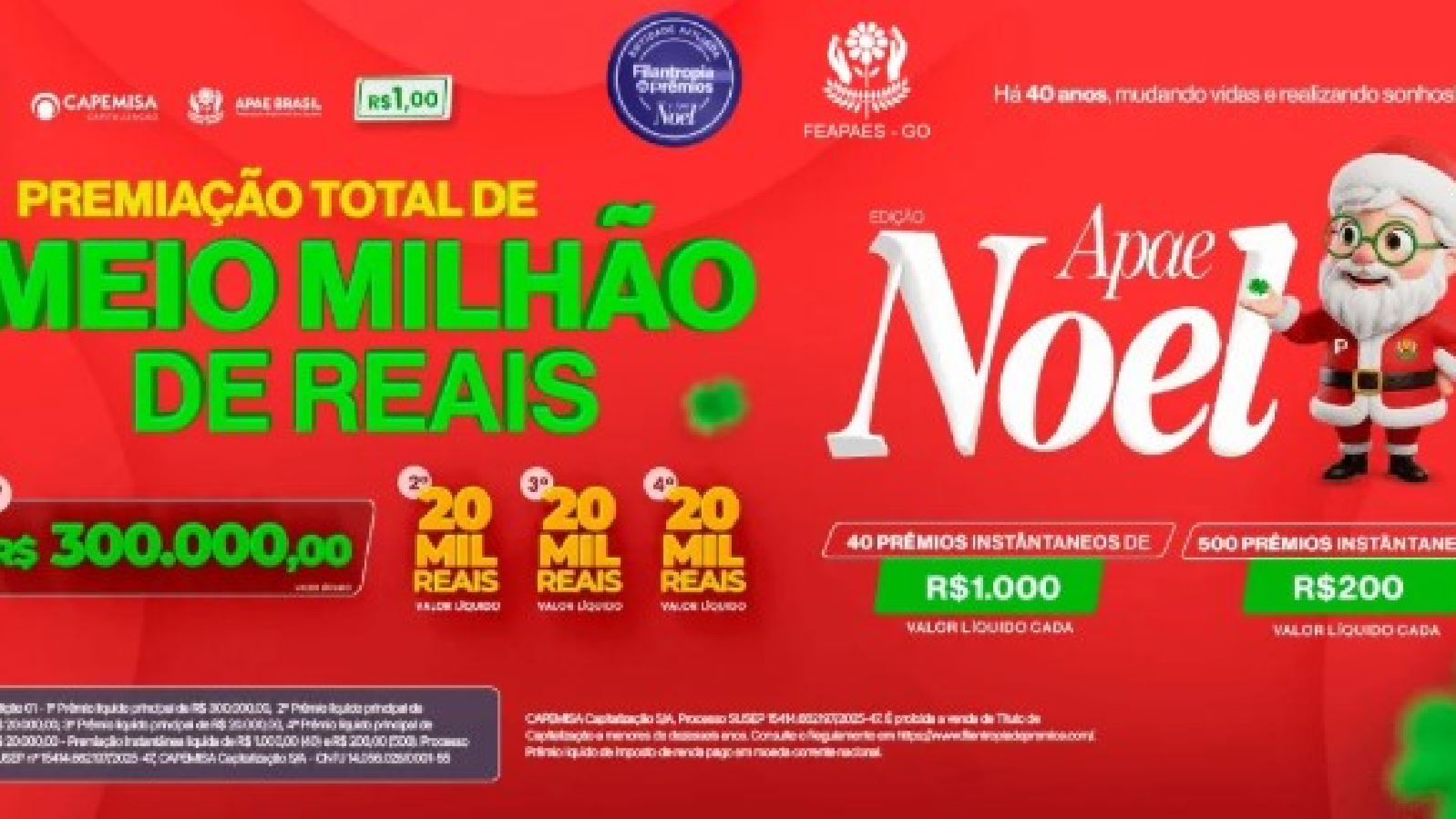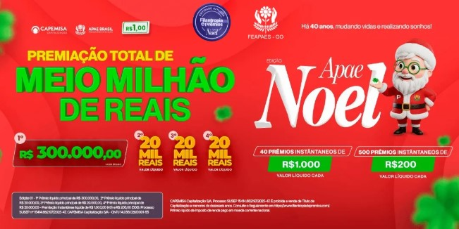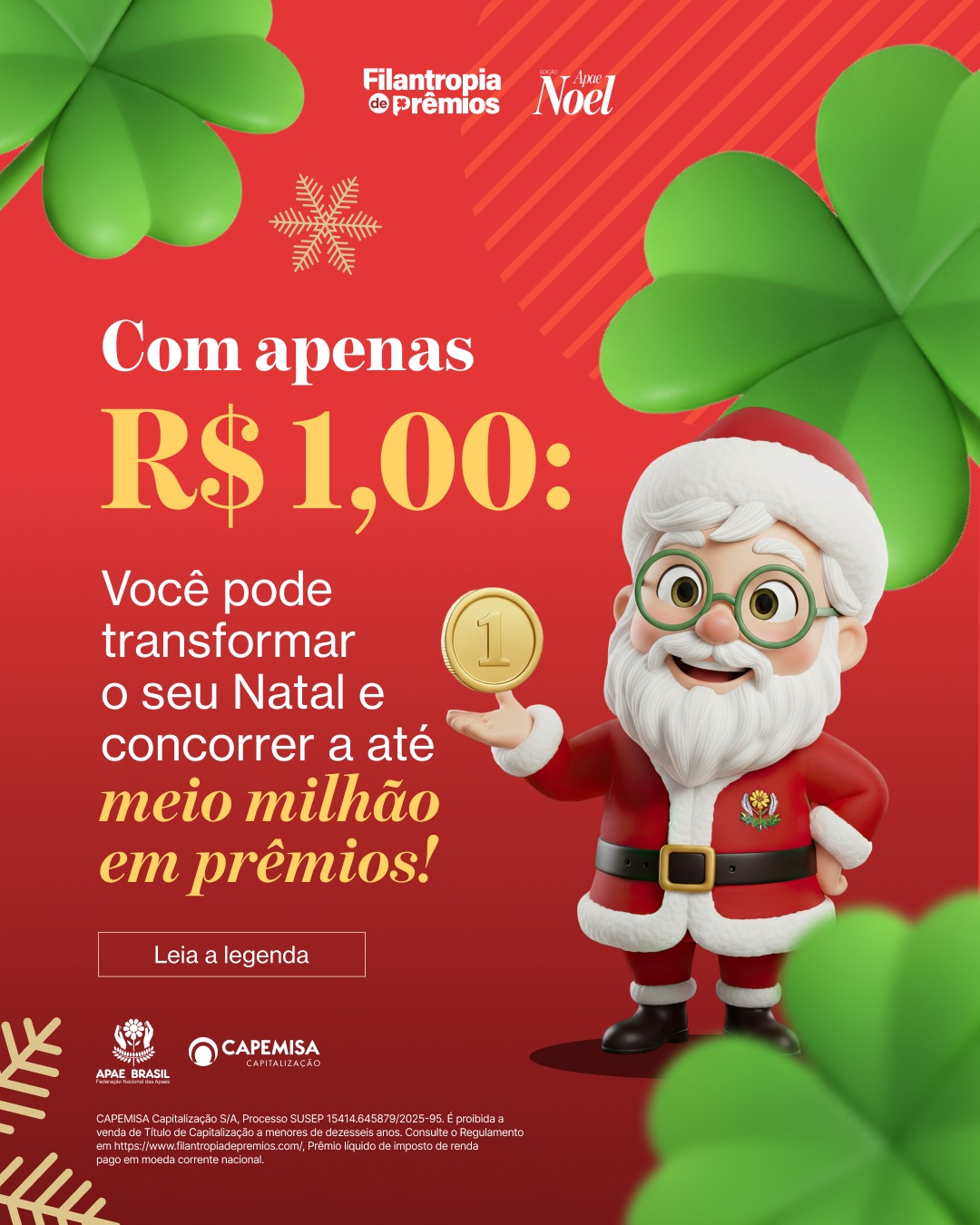 O Filantropia de Prêmios Edição Apae Noel está no ar e você já pode garantir o seu título por apenas R$ 1,00!