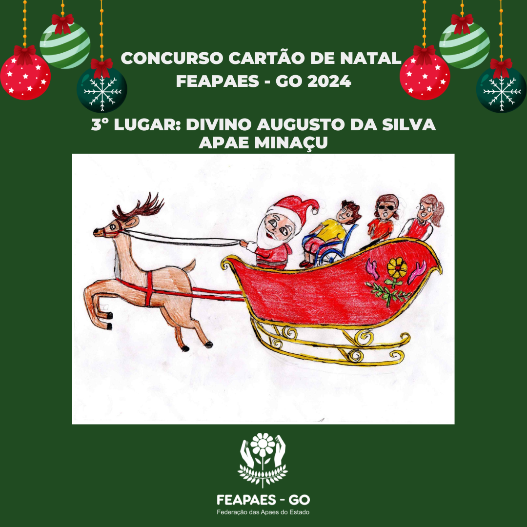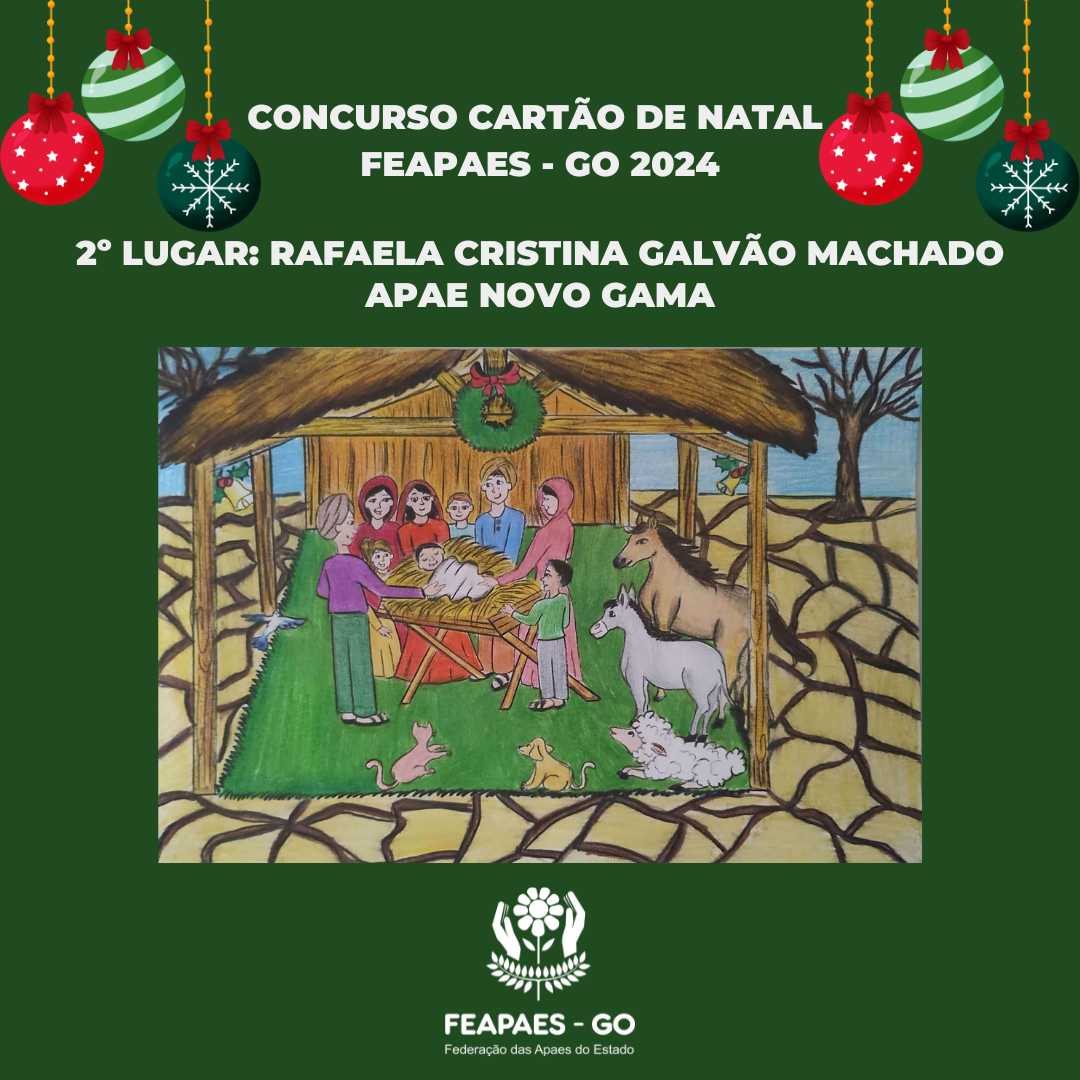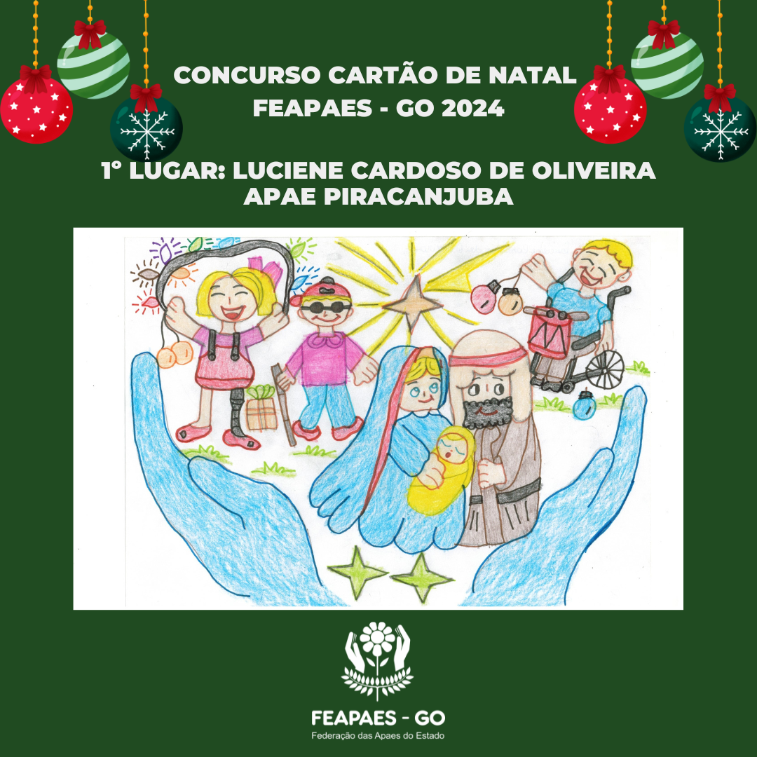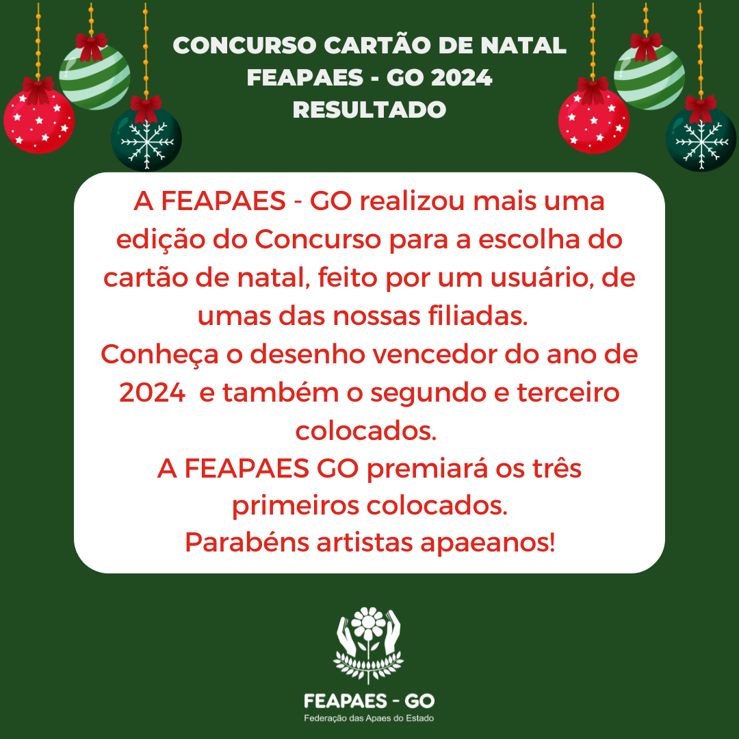 A FEAPAES - GO realizou mais uma edição do Concurso para a escolha do cartão de natal, feito por um usuário, de umas das nossas filiadas. Conheça o desenho vencedor do ano de 2024 e também o segundo e terceiro colocados. A FEAPAES GO premiará os três