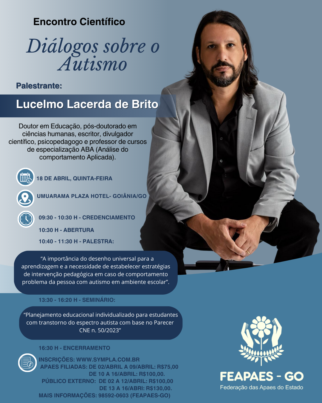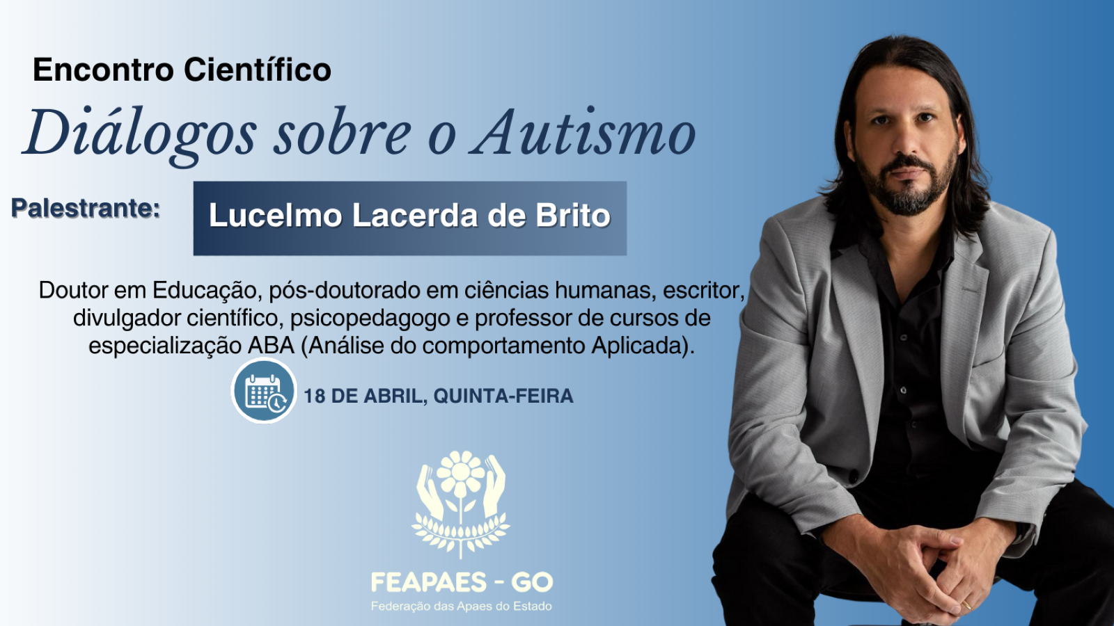 A FEAPAES-GO realiza no dia 18/04, no Umuarama Hotel em Goiânia, o Encontro Científico "Diálogos sobre o Autismo", que será ministrado por Lucelmo Lacerda :Doutor em Educação, pós-doutorado em ciências humanas, escritor, divulgador científico, psicopedagogo e professor de cursos de especialização ABA (Análise do comportamento Aplicada).