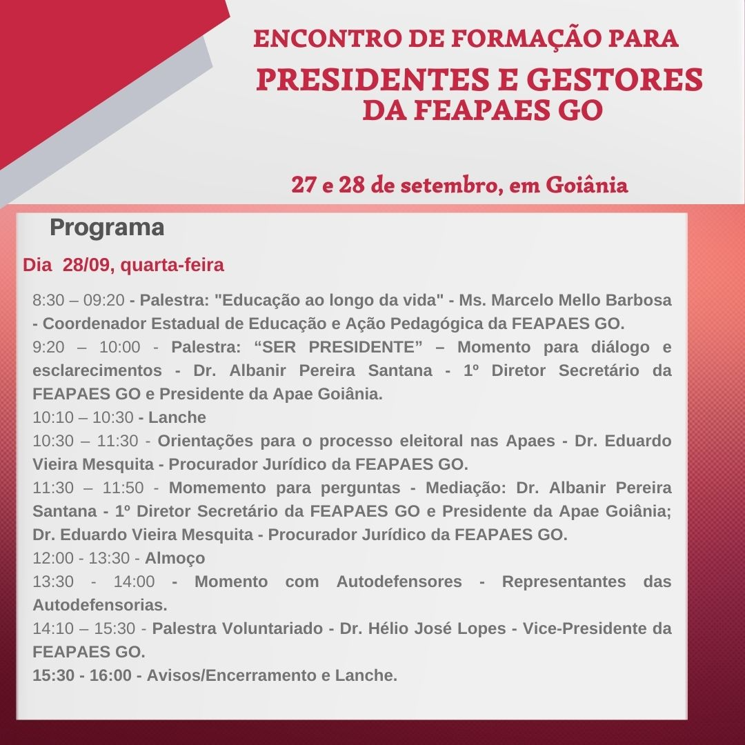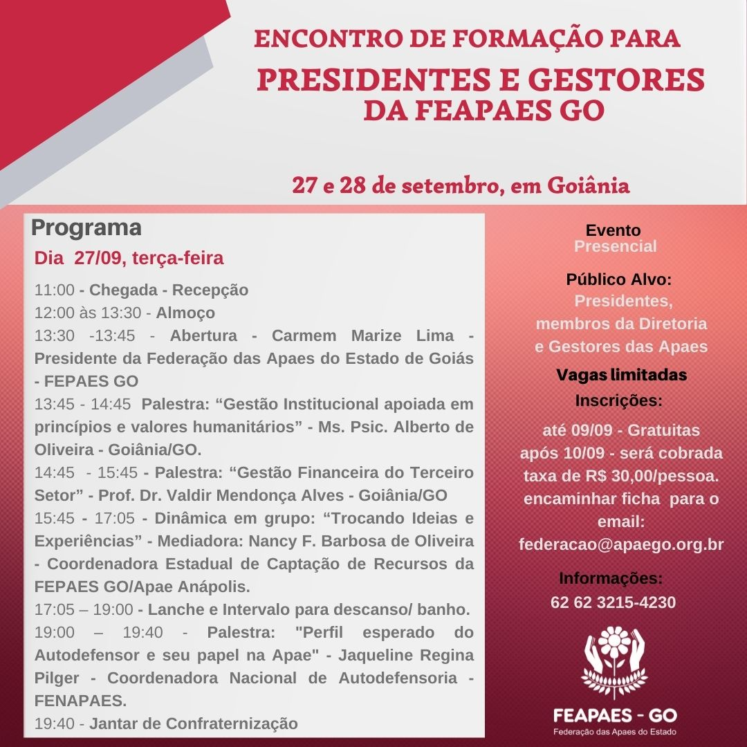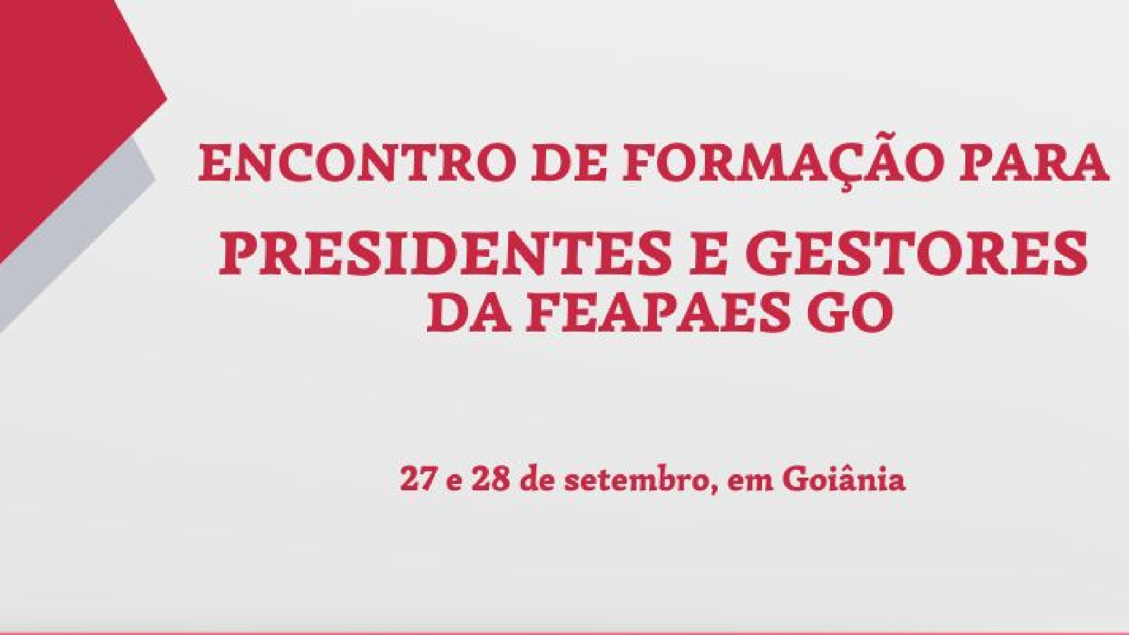 A Feapaes-GO realizará em 27 e 28 de setembro, em Goiânia, um Encontro de Formação para Presidentes e Gestores das Apaes. O evento tem o objetivo de debater o processo de eleições do próximo mandato da diretoria executiva e também apresentar palestras relacionadas à gestão do terceiro setor, procedimentos para o processo eleitoral e trocas de experiências a respeito da condução administrativa e financeira das Apaes.