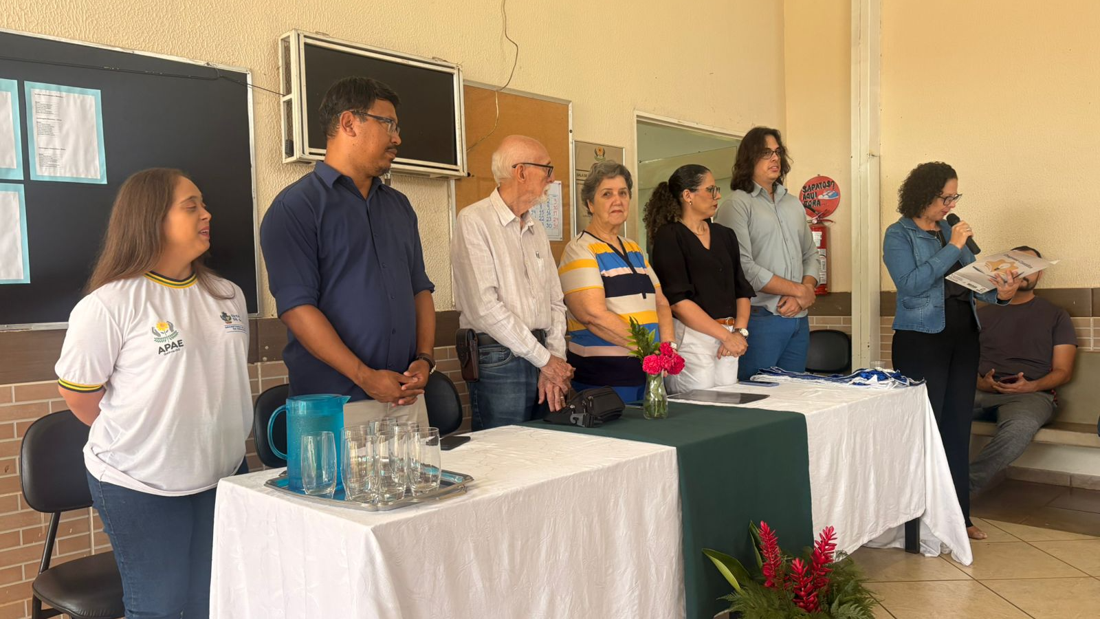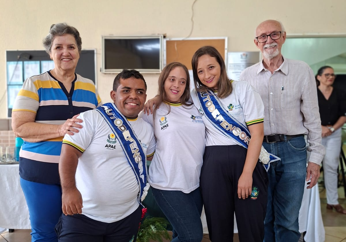 O presidente da FEAPAES – GO, Albanir Pereira Santana, e a primeira diretora financeira da instituição, Ivone Pereira Borges, e o autodefensor estadual, Victor Augusto de Araújo Holanda, participaram da mesa diretiva da solenidade, que deu posse aos autodefensores titulares: Taynara Luiz Cotrim e Thiago Vitor Martins Nascimento e aos autodefensores suplentes: Aline Santos Silva e Hélio Nascimento Martins.