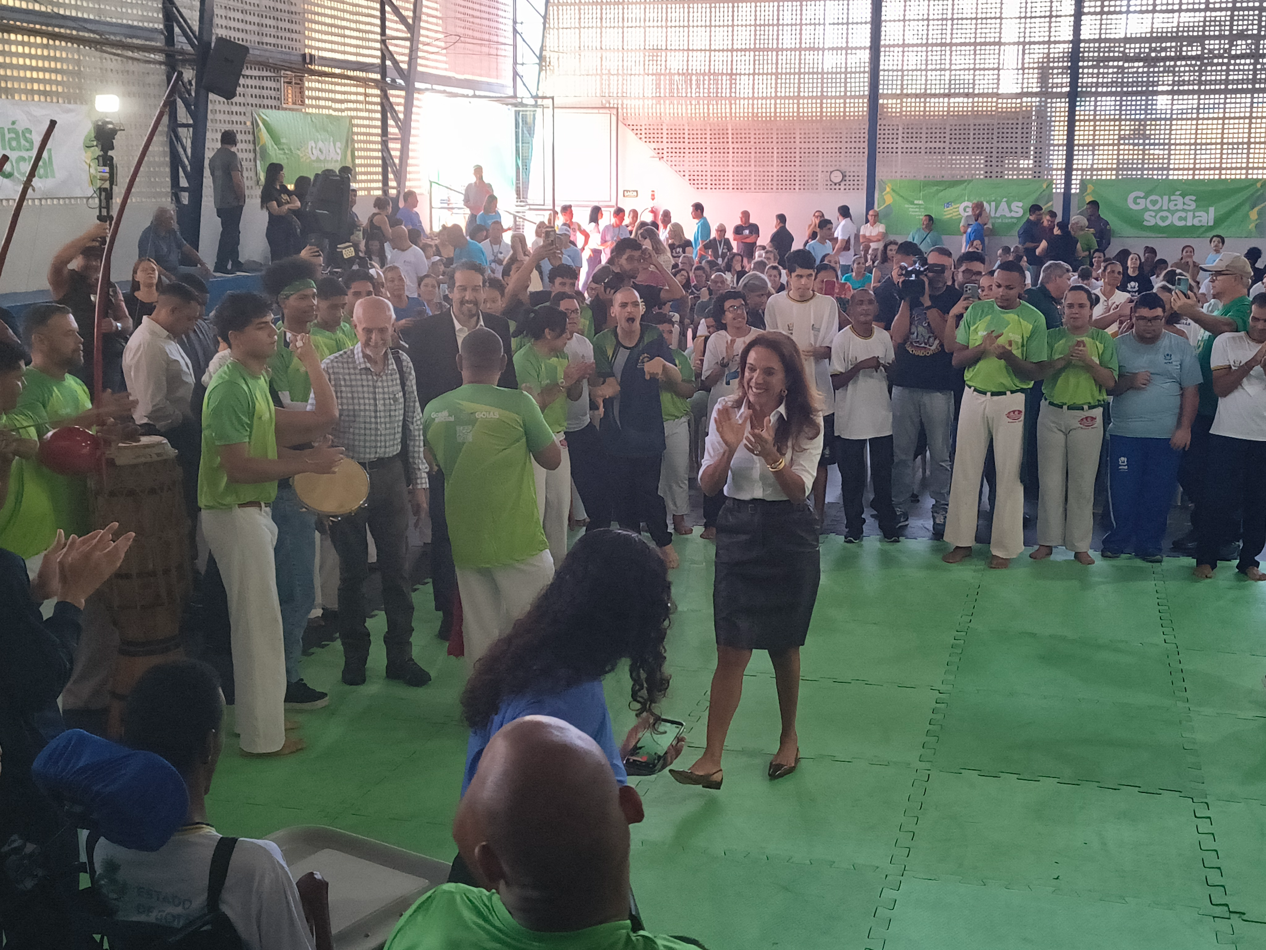 A primeira dama do Estado, Gracinha Caiado, participou, na segunda-feira, 02/03, na Apae Goiânia, da entrega dos materiais esportivos e instrumentos, às turmas de capoeira adaptada inclusiva, que integram o projeto Construindo Campeões, realizado pela Secretaria de Estado de Esporte e Lazer e que são ministradas pelo grupo Abadá Capoeira Apae Goiânia.