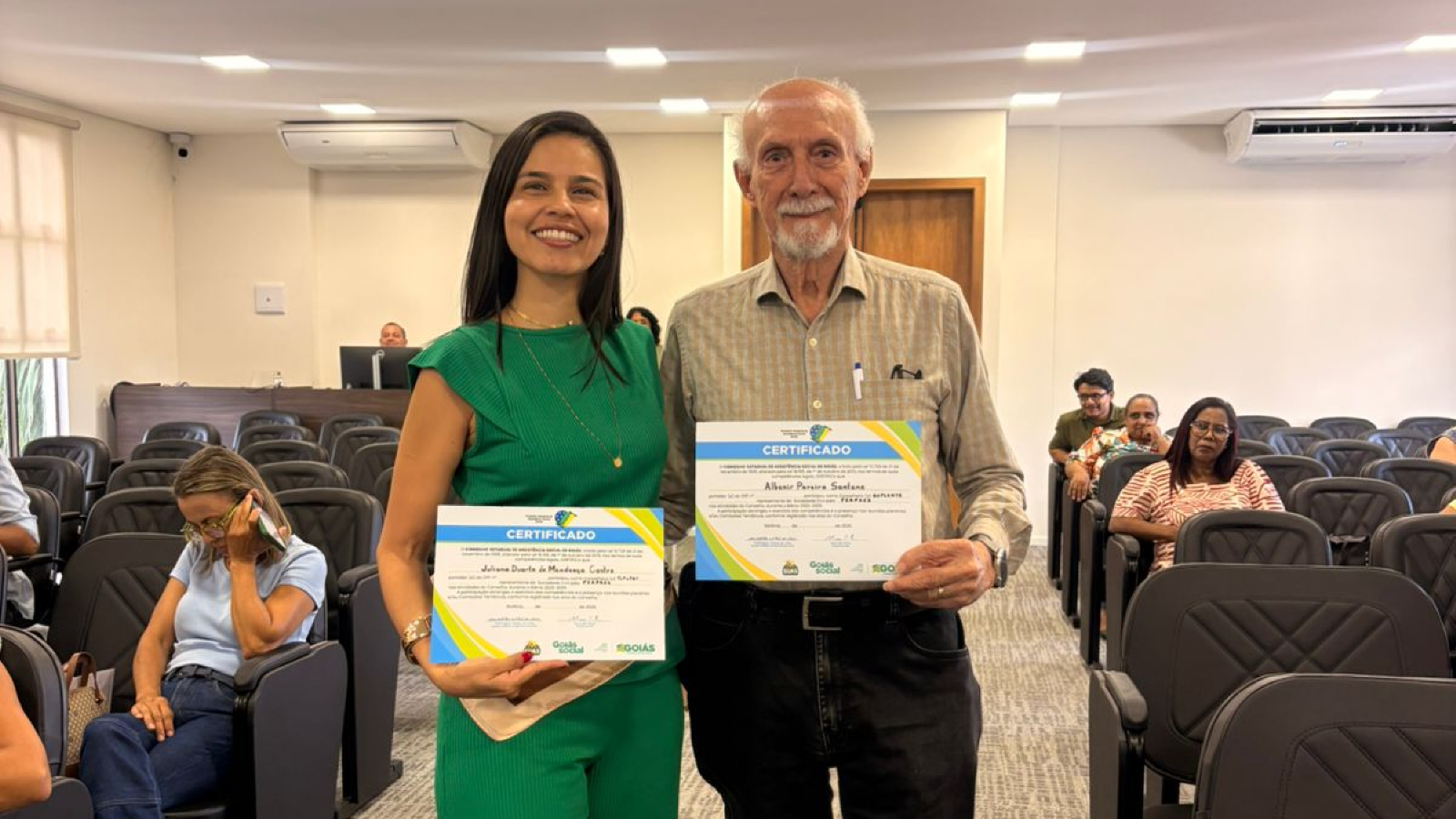 O presidente da Federação das Apaes do Estado de Goiás – FEAPAES – GO, Albanir Pereira Santana e a assistente social e voluntária da instituição, Juliana Duarte, participaram da 157a Reunião Ordinária do Conselho Estadual de Assistência Social - CEAS, na tarde de quinta-feira, 12/02, no Auditório da Secretaria de Estado de Desenvolvimento Social – SEDS.